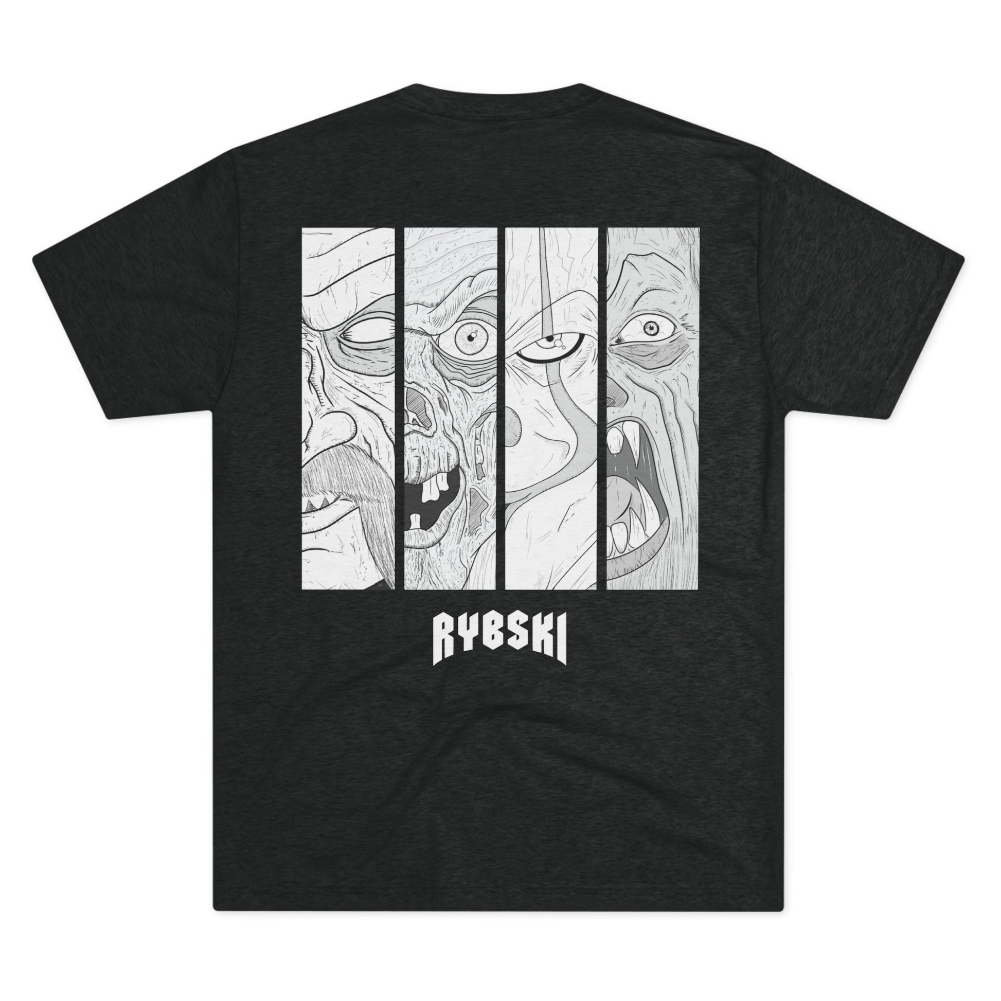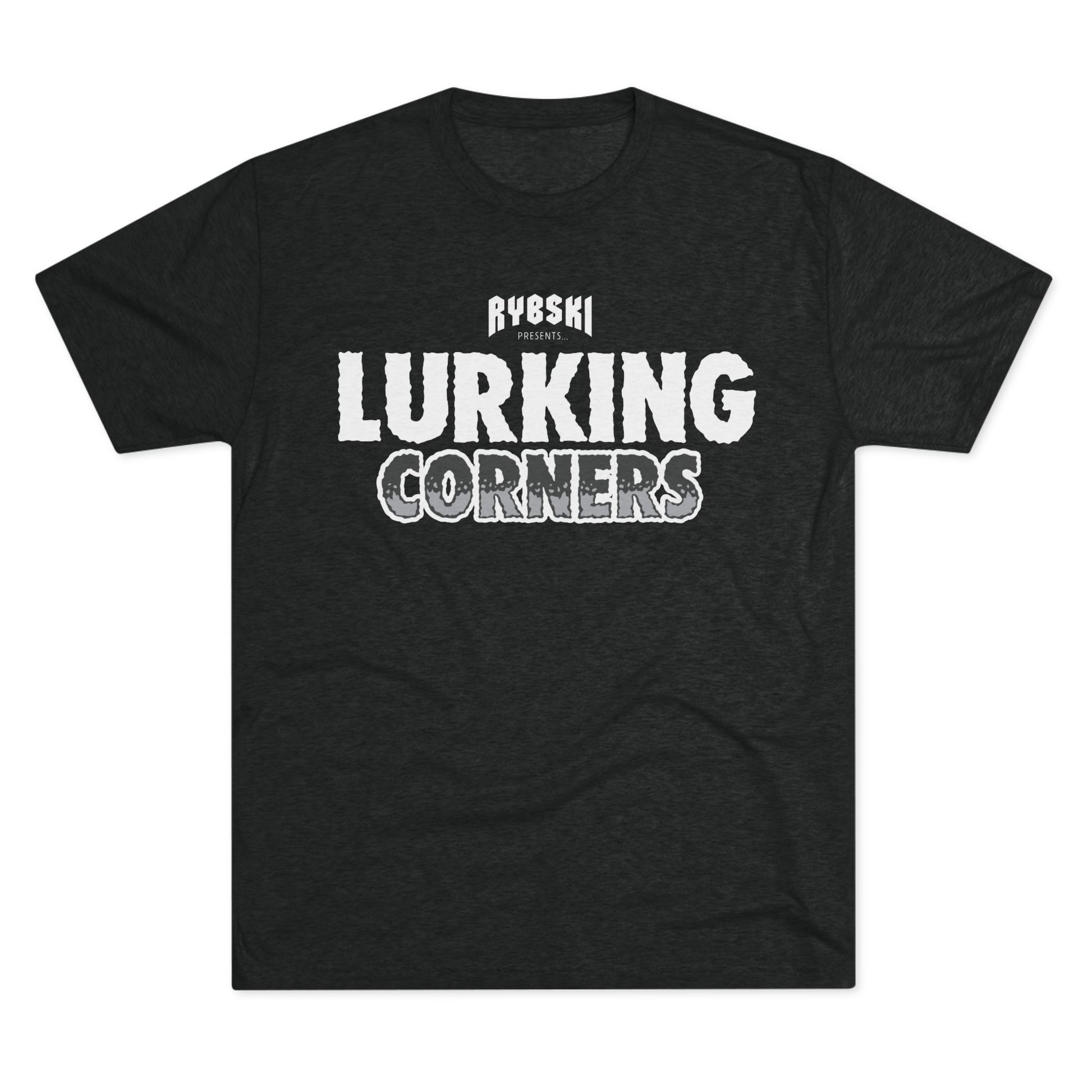 A graphic logo tee of Chris Rybski's debut book, Lurking Corners. This unisex tri-blend crew tee is made of a super soft and durable fabric blend of polyester, combed ring spun cotton, and rayon.